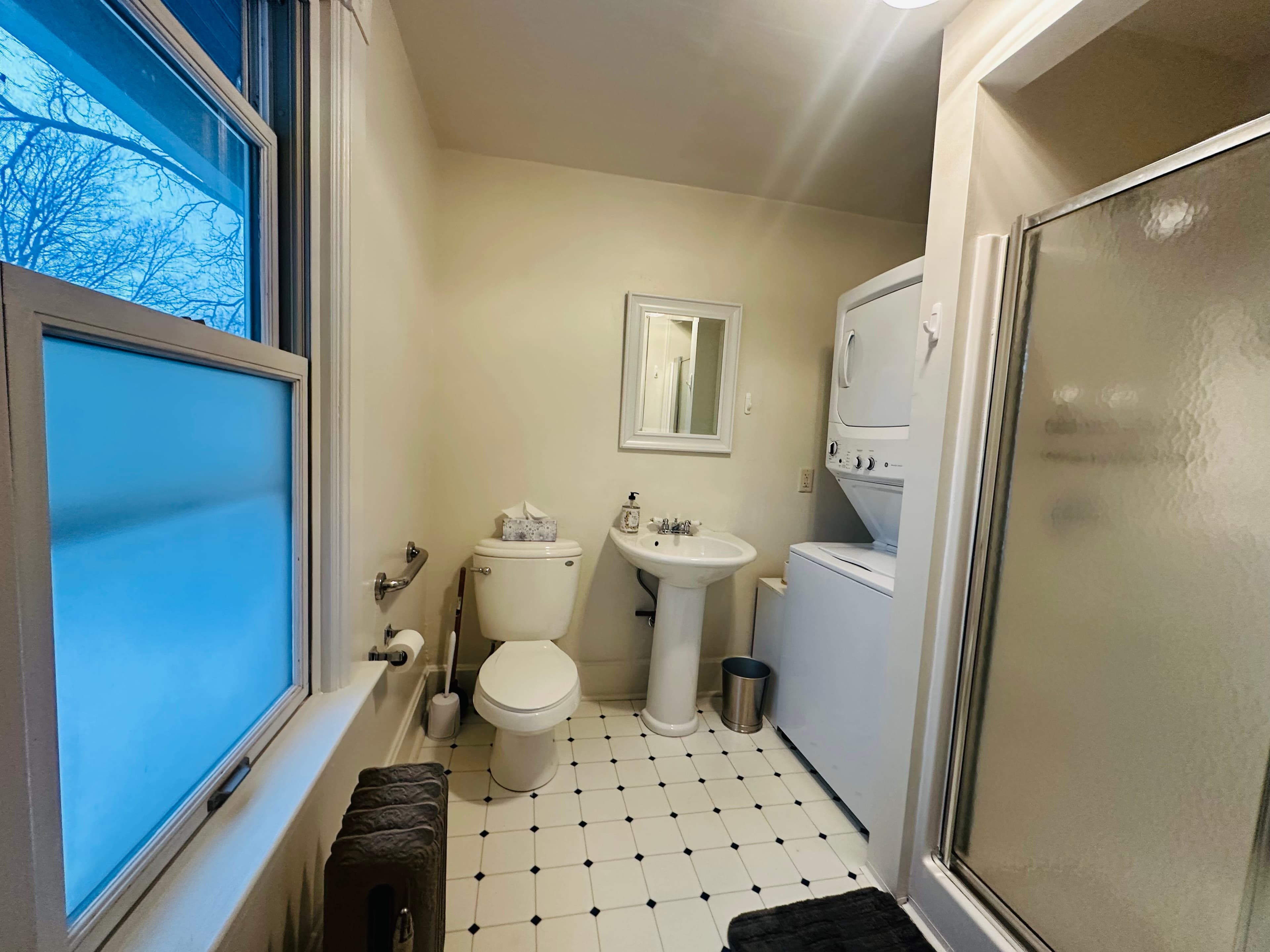Inside, you'll find a welcoming living room, a charming and well-equipped kitchen, a bedroom with a spacious walk-in closet, and a full bathroom with a shower and in-unit laundry. Thoughtful renovations blend historic character with modern comfort, making this space ideal for both short getaways and extended stays.