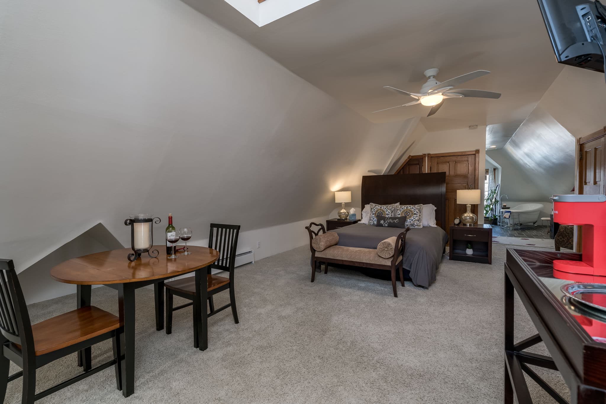 Provided for your convenience and comfort, you will enjoy the queen 4-poster bed, electric fireplace, private bathroom with double vanity, shower, small clawfoot tub,cozy bathrobes, climate controlled room, Smart TV with Cable and Google Nest speaker. Sleep well on our new DreamCloud hybrid mattress.